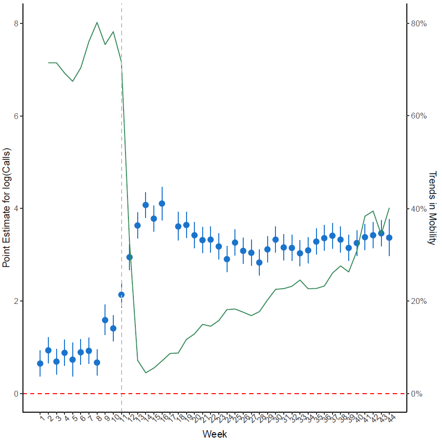 Note: The green line graphs the average trend for walking, driving and public transit mobility indicators as described previously. Blue dots correspond to the point estimates and confidence intervals. Source: Author’s own estimations using data provided by Llamando al Doctor. A Shifting Demographic