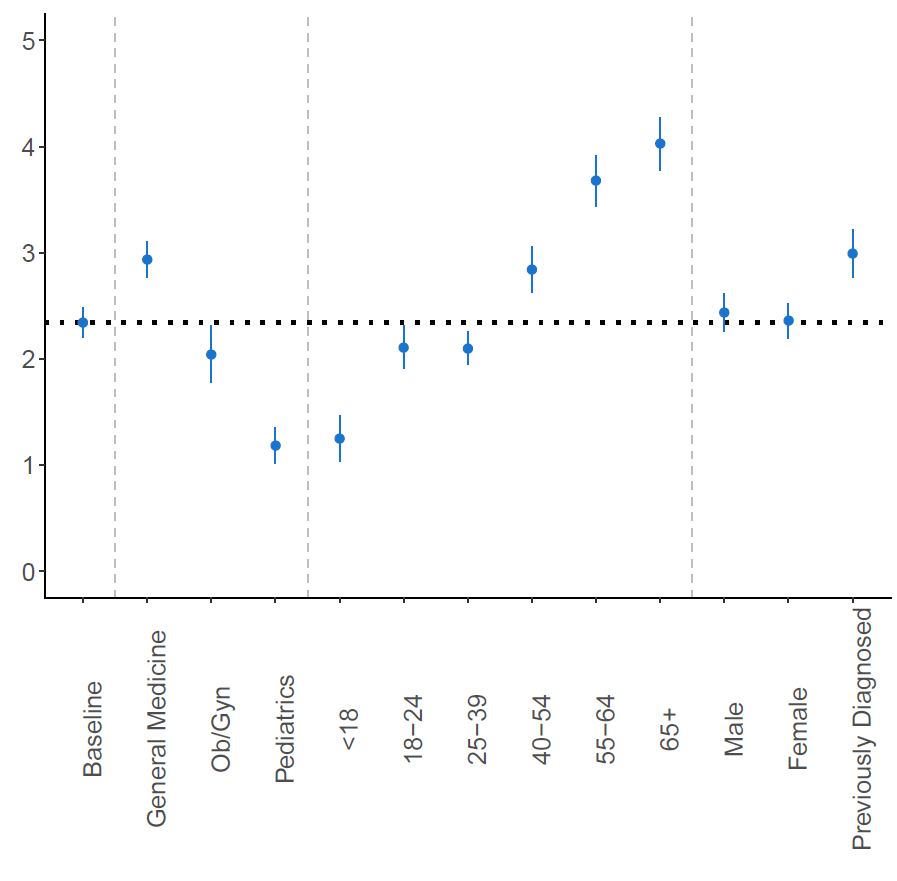 Notes: The figure plots the coefficients estimating increase in number of calls for each different subgroup. Source: Author’s own estimations using data provided by Llamando al Doctor. It is, of course, impossible to know for sure how durable these changes will be. Argentina, like much of Latin America, is still in the midst of the COVID-19 crisis with sustained social distancing measures. Moreover, we don\'t have a proper control group, making past behavior the only available point of comparison. This complicated scenario leaves unanswered questions, particularly as to whether there have been other confounding factors that could have affected the demand for telemedicine during the pandemic.