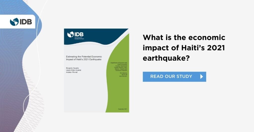 Haiti is once again grappling with the effects of a severe natural disaster and now faces the complex task of raising funds and ensuring that relief and reconstruction reach the affected areas. The IDB 2025 Vision, recently published, highlights building resilience to natural disasters and the capacity to respond rapidly to such events when they occur. In order to react nimbly and with the appropriate resources, an early estimate of the magnitude of economic damages is critical. We hope that these estimates will be useful to the government and its international partners in helping them plan critical relief and reconstruction efforts that, in turn, will enhance resilience to these events in the future.