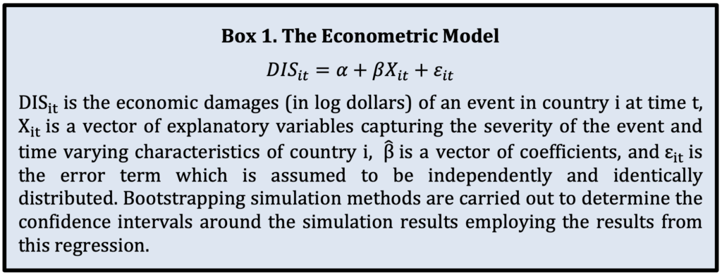 The methodology is based on an econometric analysis using an extensive dataset of major events across many countries in the world. The dollar amount of damages of disasters is estimated using variables that capture the severity of the event and the characteristics of the country, including the number of dead or missing, the level of economic development (real GDP per capita), the population of the country, the country’s land area and the total income of the country (GDP). Regional dummies and a linear trend are also included in the preferred version of the regression. The box below details the model and the variables used. The regression results are then used to produce predictions regarding the estimated value of damages (in US dollar and as a percentage of GDP) that can be expected for a country with Haiti’s economic and demographic characteristics in the aftermath of this earthquake.