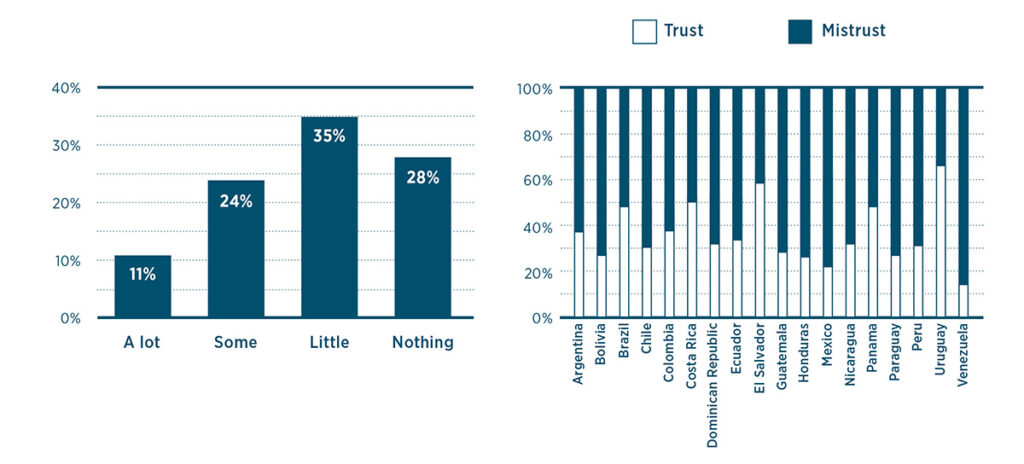 Source: Latinobarometer 2021. In summary, lower trust is associated with a lower willingness to allocate resources to the police and provide information to solve some crimes. This can become a vicious cycle: fewer resources and less information on crimes can reduce the capacity and effectiveness of policing agencies, further eroding public trust in these institutions.