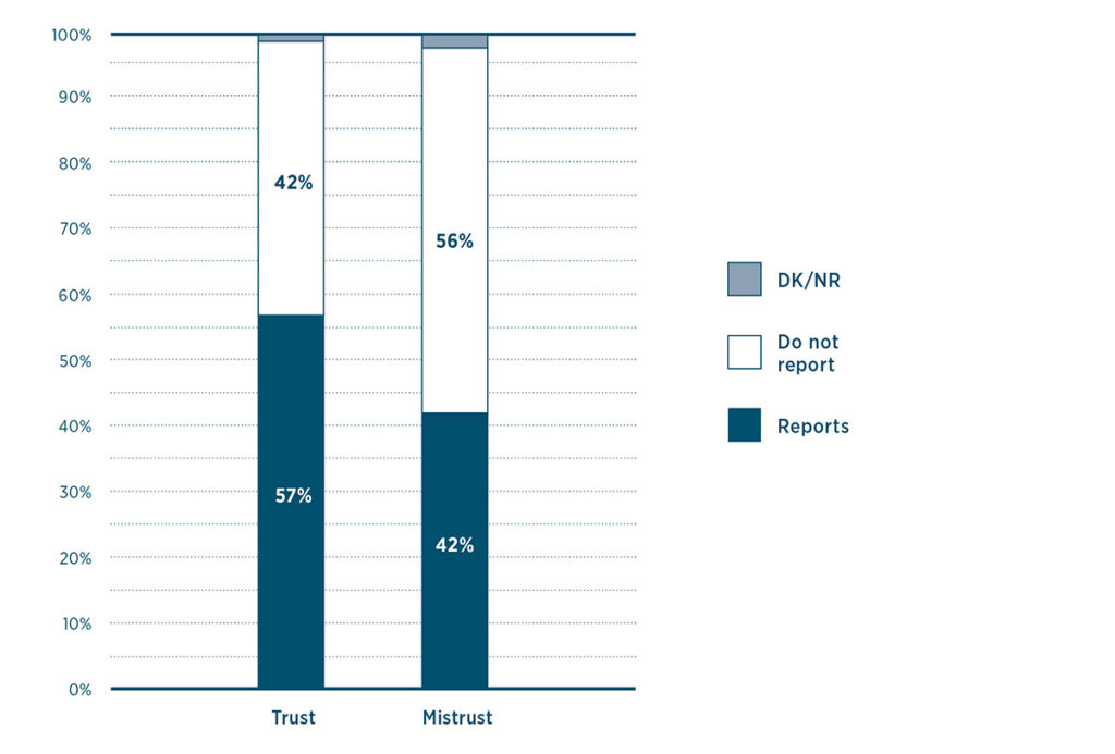 Source: Latinobarometer 2021. Lower trust in the police also correlates with a lower probability that citizens report minor infractions, like the theft of a cellphone or a bicycle. In the same sample of 20,000 Latin Americans, approximately 60% of those who trusted the police said they would report such crimes, but only 40% of those who did not trust the police said they would do so (Figure 3). This reporting is key for setting policing strategies. It makes it possible to allocate resources efficiently and assess strategies’ success or failure.