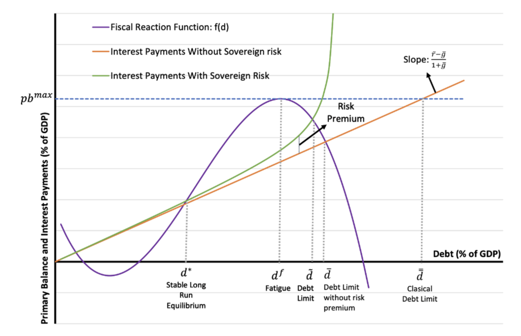 Fiscal fatigue can be visually depicted by charting the relationship between the primary balance and debt—a relationship encapsulated in a fiscal reaction function (FRF). In Figure 1, fiscal fatigue starts to appear when the slope of the FRF starts to decrease and becomes critical at the point where the primary balance reaches its maximum value. Beyond this level, the primary balance can\'t keep pace with the rising debt, leaving governments unable to meet their financial obligations.