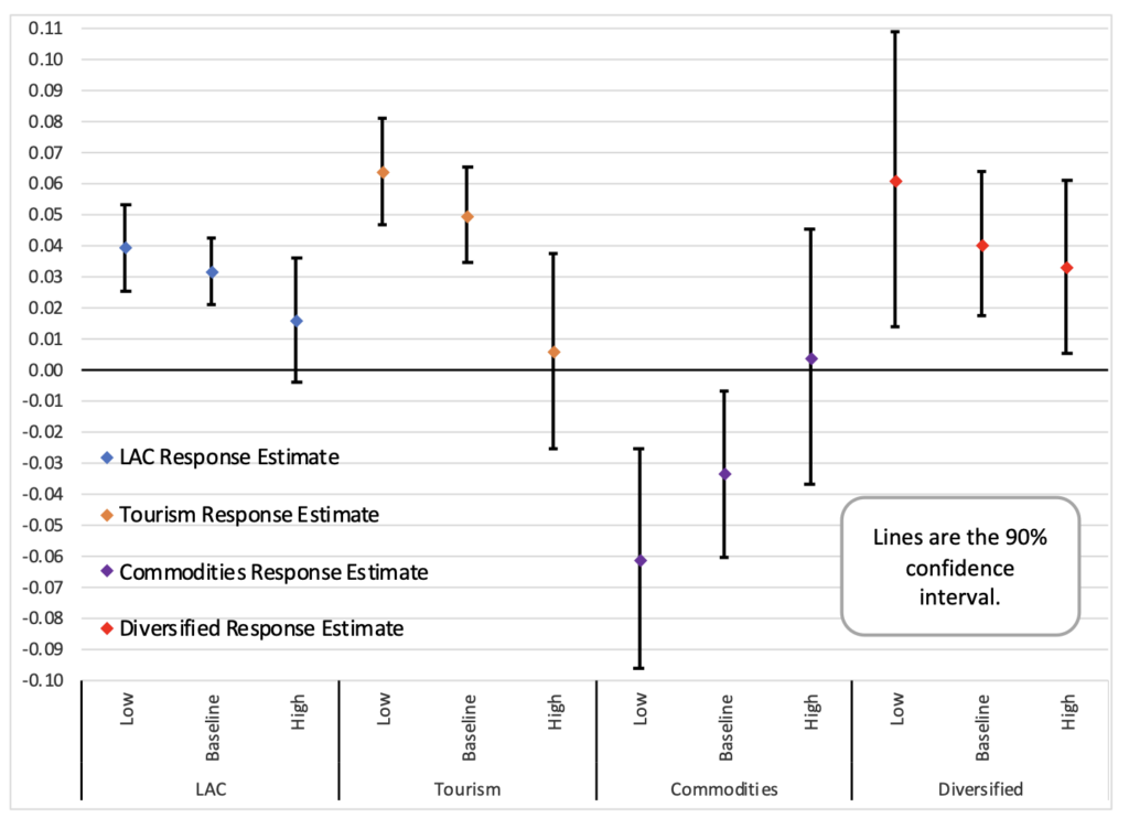 We further split the region’s countries according to their main export: Tourism, commodities, or diversified (those countries whose main export is neither tourism nor commodities). This pools together countries facing the same external shocks, like changes in commodity prices or tourism flows, and allows for a cleaner look into how their fiscal policies react. When we estimate the slope of the FRF for each of these groups, we found some evidence of fiscal fatigue in countries that belong to the tourism and diversified groups.