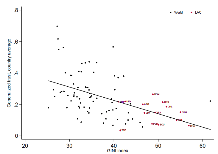 Source: IDB staff calculations based on data from the World Value Survey and the World Development Indicators, The World Bank.Notes: The trust data come from the six waves of the World Value Survey (1981 – 2014). GINI Index data comes from World Development Indicators, The World Bank (1981 – 2017). The total sample has 88 countries including Argentina, Brazil, Chile, Colombia, Dominican Republic, Ecuador, El Salvador, Guatemala, Haiti, Mexico, Peru, Trinidad and Tobago, Uruguay, and Venezuela.