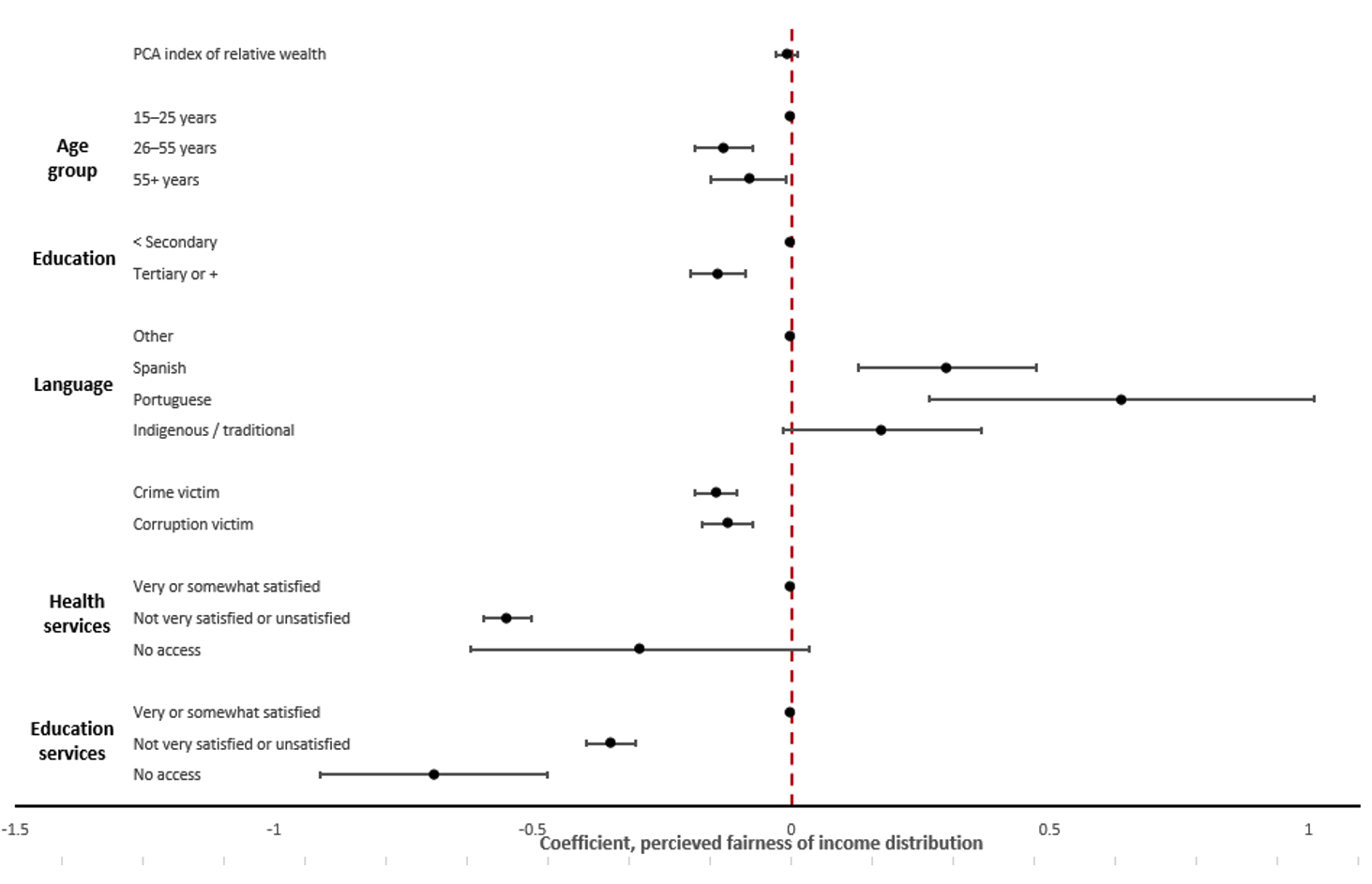 Source: IDB staff calculations based on Latinobarometer data.Notes: The dependent variable, the perceived fairness of the income distribution, comes from the question: “How fair do you think income distribution is in your country?” The scale of answers ranges across very unfair, unfair, fair, and very fair. An ordered logistic regression was used with robust standard errors, at a 90 percent confidence interval. Dots represent coefficients of regressions, and the lines are confidence intervals. The total sample consisted of 28,860 individuals in 18 countries across the region, taken from the 2007 and 2016 surveys.