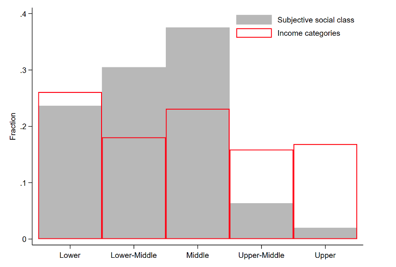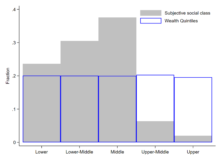 The truth is that people are not very good at correctly identifying where their income lies in regard to national income levels. Moreover, they find it hard to evaluate the distribution of income dispassionately, as their social preferences make them strongly averse to earning less than others. Figure 2 below explores those biases. It uses people\'s perception of their social class from a Latin American Public Opinion Project (LAPOP) survey against wealth and self-stated income. In both panels, individuals in the higher quintiles of income and wealth distribution tend to believe that they belong to a lower class than that shown by their registered income or household wealth. At the other extreme of the distribution, poor people tend to overestimate their place in the income distribution.