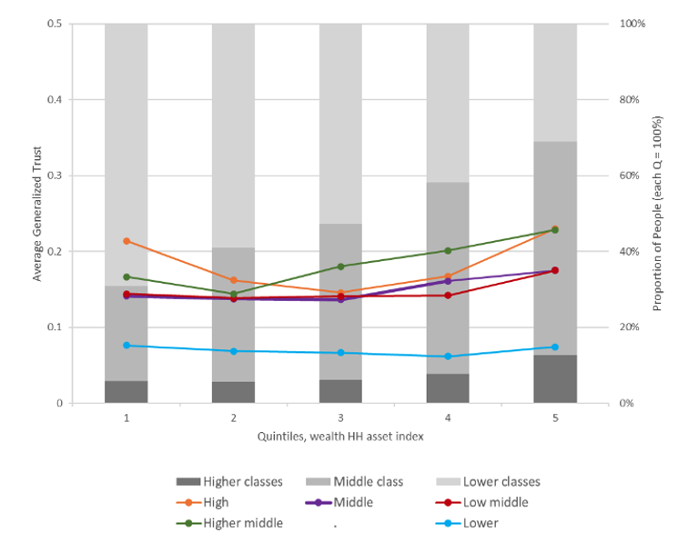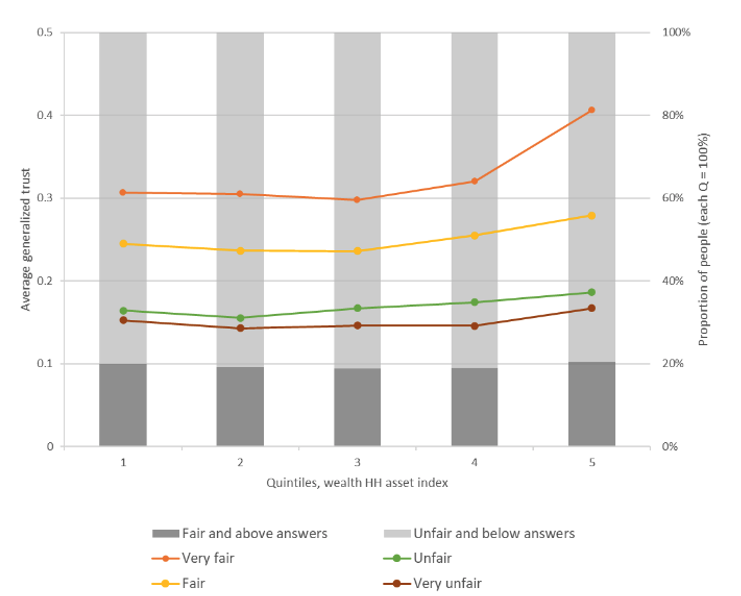 How do these biases influence individuals\' trust? Figure 3 captures some of the dynamics. For example, Panel A shows trust levels by wealth quintiles and for different degrees of perceived fairness in the income distribution. The lines indicate the levels of trust for each quintile and each level of perception regarding income distribution (left vertical axis). The bars identify the share of people who think that the distribution is fair or unfair (right vertical axis). Interestingly, despite the fact that interpersonal trust rises slightly across the wealth distribution, it is respondents\' perceptions that make more of a difference. Panel B reveals another important piece of evidence: Very few people in the entire sample, regardless of their wealth quintile, consider themselves part of the upper class (the darker bar increases only slightly with actual wealth).