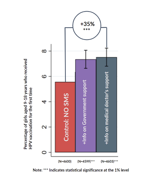 Some of the messages that were successful were designed with parents like Rosa in mind: messages indicating the government’s and doctors\' support for the vaccine. The group of mothers who received a message indicating doctors\' approval, for example, experienced a 35% increase compared to a control group that didn’t receive any message (see graph). The results from this and other messages tested in the intervention can be found on the IDB’s Behavioral Economics Group website. The toolkit explains the methodology applied, the results, and the content that proved most helpful. Most importantly, it is a guide for policymakers to help them think about ways to increase HPV vaccinations in their area.