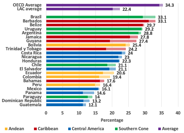 Given the need for fiscal consolidation, policymakers can directly increase tax revenues by increasing tax rates, levying new taxes, or expanding the tax base by reducing tax expenditures or improving enforcement. It may be tempting to increase taxes (tax rates or the creation of new taxes), thereby increasing collection, but it might be difficult to do so, and in some cases, even counter-productive. A long-term issue in Latin America is its relatively low tax collection, averaging 22.4% of GDP, which is lower than in developed countries (it is 34.3% in the OECD, see Figure 1). However, there is substantial heterogeneity across the region, ranging from high taxation countries like Brazil, Barbados, Belize, Uruguay, and Argentina -where it lies between 29% and 34% of GDP- to low taxation countries such as Guatemala, Dominican Republic, Paraguay, Panama, Mexico and Peru - where it lies between 12% and 16% of GDP. For high taxation countries, policies different from increasing tax rates—and involving expenditures more heavily—will be in order. For low-taxation countries increasing tax bases as recovery gains momentum and ultimately increasing tax rates is the way to go to increase tax collection. But it should be done in a way that does not substantially damage growth and inequality.