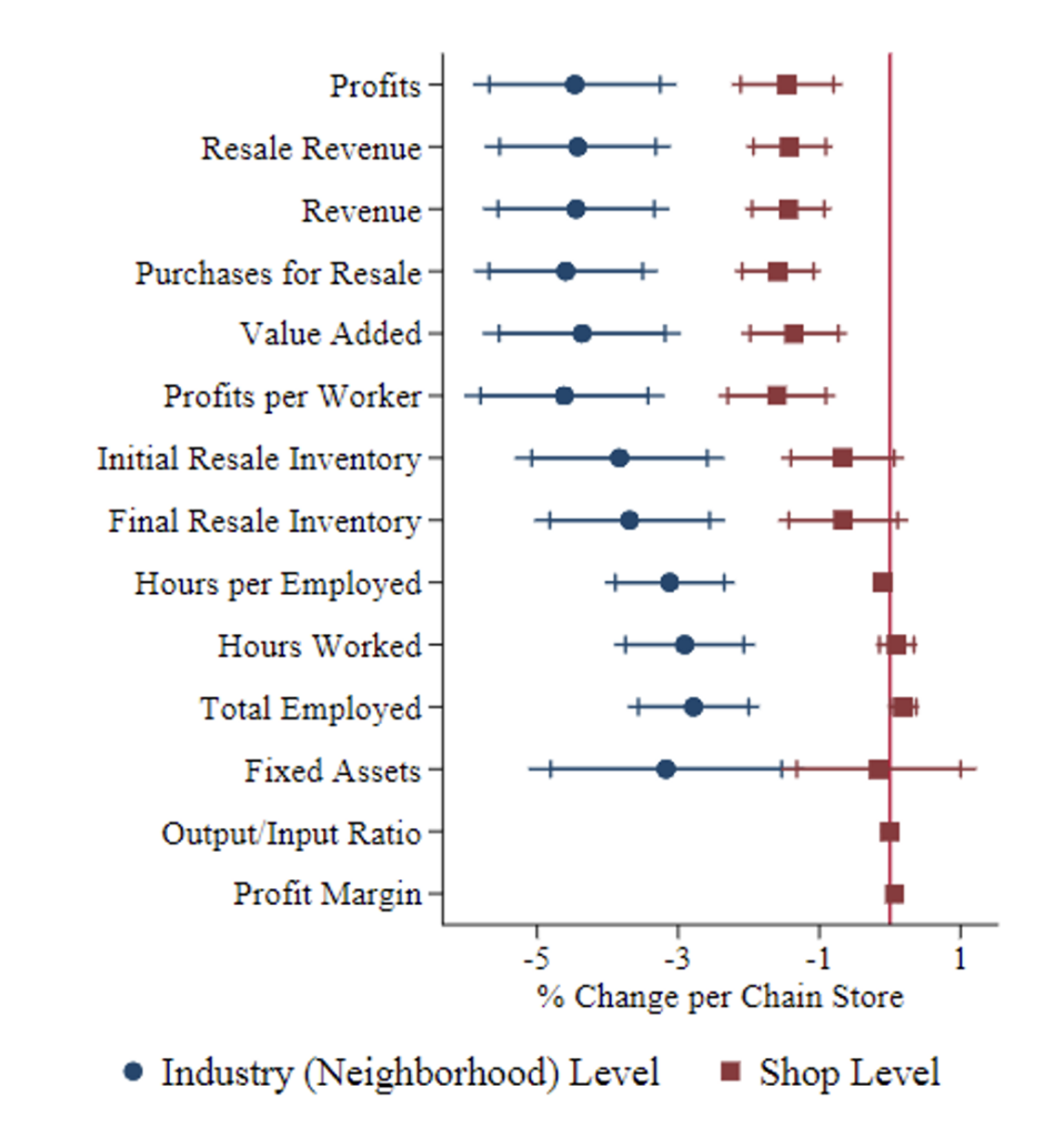 Note: The figure displays the average effect of an additional convenience chain in the neighborhood on tienditas. The confidence intervals are 90% and 95%. The introduction of the chain stores has had an unquestionably competitive effect, I found. An additional convenience store in a neighborhood reduces the number of tienditas by four. This means that expanding from zero to the average number of chains in a neighborhood reduces the number of tienditas by 15%. This reduction is not driven by more tienditas exiting the market, but by a 21% decrease in tiendita openings. The adverse effects on tienditas concentrate on the extensive margin. At the neighborhood level, total profits, revenues, value-added, inventories, employees, and hours worked decrease by 20% to 30%. However, the magnitude of these adverse effects at the store level (intensive margin) is lower, ranging from 0% to 7%.