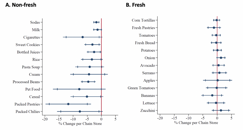 Customers still shop at tienditas, but less frequently. An expansion of convenience chains from zero to the average number in a neighborhood decreases the probability of neighbors shopping at tienditas by 4%. Those who continue shopping at tienditas do so 7% less often and buy 10% less. Chains do not affect household expenditure in tienditas for fresh products such as pastries, fruit, and vegetables, often sourced daily by shop owners from central markets. Still, they decrease household purchases in the traditional shops by 15% for packed and standardized products, like sodas, milk, and bottled juices.