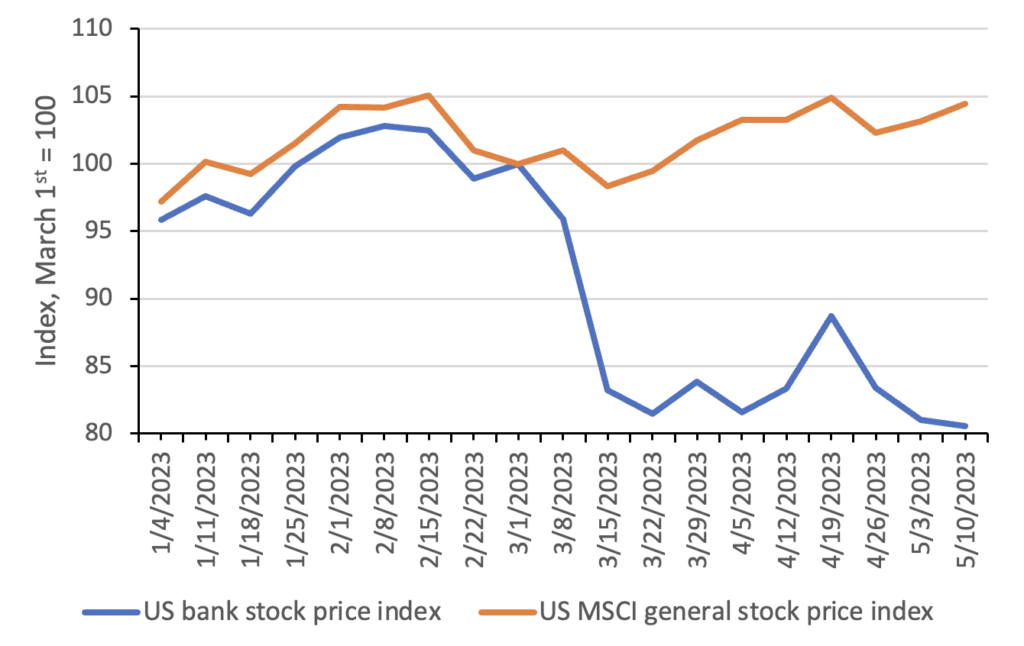 Several bank failures, and the high volatility in US bank equity prices, have raised considerable concern in recent weeks. The March 10 failure of Silicon Valley Bank (SVB) followed just two days later by that of Signature Bank shocked many observers. There were hopes that these were isolated incidents, but other regional banks soon came under pressure. First Republic Bank suffered a collapse in its share price and was taken over by regulators and then sold to JP Morgan on May 2. (Figure 1 tracks the fall in US equity prices and an index of US bank stocks).