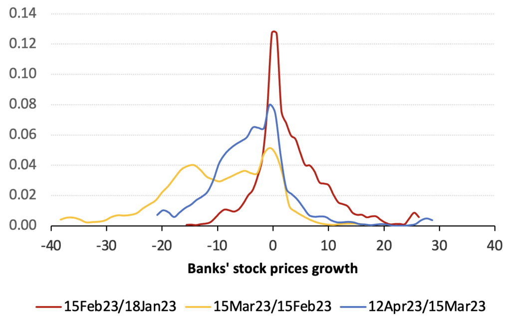 To illustrate the heterogeneity in stock price fluctuations across banks, Figure 4 plots the distribution of the changes in equity prices in the US (Panel A) and Latin America and the Caribbean (Panel B). The US distribution shifted sharply to the left, and a large left tail developed after the collapse in SVB, largely driven by the regional banks. This pattern is not evident in Latin America and the Caribbean.