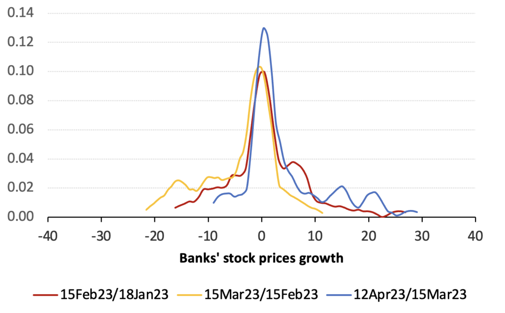The median bank in the US suffered a fall in its equity value of 9.4% between mid-February and mid-March (just after the SVB collapse). But that same figure is just -1.6% in the case of banks in Latin America and the Caribbean. And considering the left tail of the distribution, the 25th percentile bank in the US experienced a 16% fall between mid-February and mid-March and a further fall of 8.2% between mid-March and mid-April. The analogous bank in Latin America and the Caribbean fell 8.7% in February-March and did not drop at all in March-April (equity values remained unchanged).