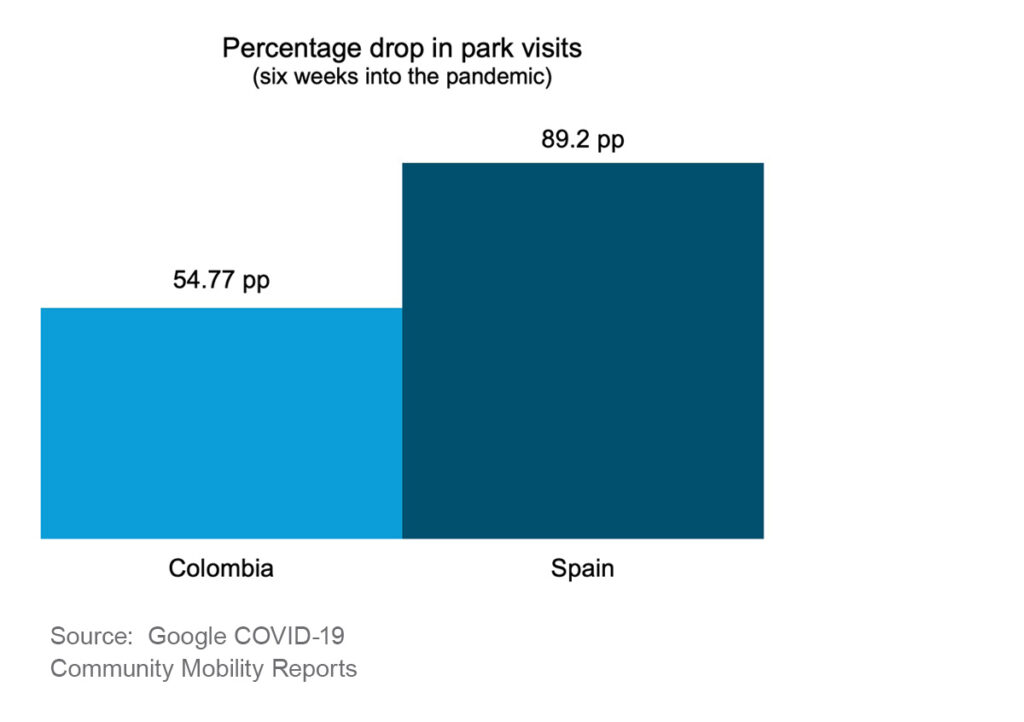 The survey included randomized experiments to examine the effects of different scenarios related to the COVID-19 pandemic on the policy attitudes of public sector employees. In one of the experiments the survey measured attitudes toward social distancing policies. One treatment, positive framing, showed respondents a bar chart with the country’s level of social distancing at the beginning of the pandemic, alongside the world average, which at the time of the experiment was lower than in Latin American countries. Thus the positive treatment presented a scenario of relatively high social distancing. The other treatment, negative framing, showed a similar bar chart reporting each country’s level of social distancing alongside the national statistic of Spain, which at the time had greater adherence to social distancing than Latin American countries. Thus the negative treatment presented a scenario of relatively low social distancing. See Figure 1.