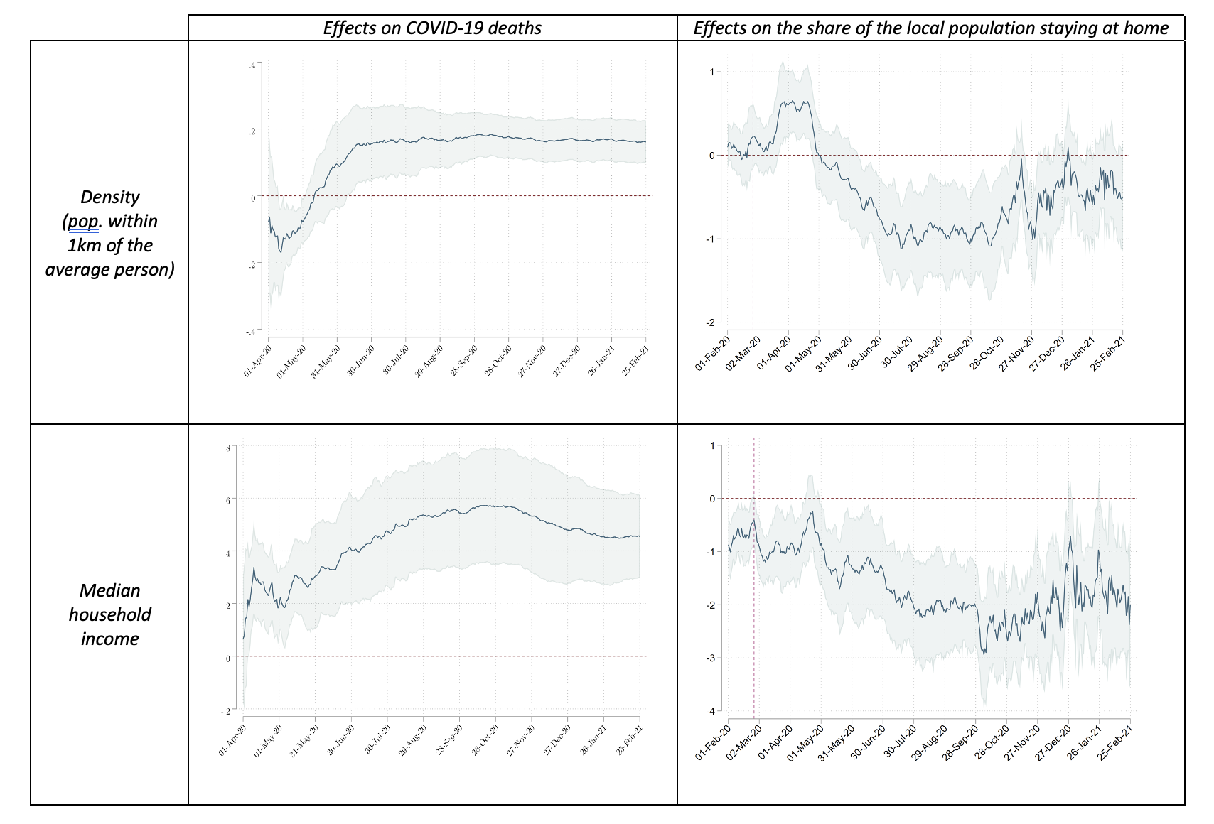 But not all the drivers of the local impact of COVID-19 in Brazil resemble those from the US. In the US, cities with higher median income had, controlling for all other factors, fewer COVID-19 deaths per capita during most of the first year of the pandemic. In Brazil, the opposite was true. This seems to be at least partially explained by the fact that, contrary to the US, the population from richer and denser cities in Brazil was relatively less likely to stay at home than the national average (Figure 1, right column). As in much of Latin America and the Caribbean, large shares of the population in Brazilian citieslive hand-to-mouth, and don’t have enough savings to support prolonged periods of economic inactivity. Higher-income cities tend to have a higher demand for goods and services and therefore support more local jobs. Since a large share of these jobs cannot be performed from home, this creates more incentives for mobility and human interactions, which in turn can expose individuals to additional infections.