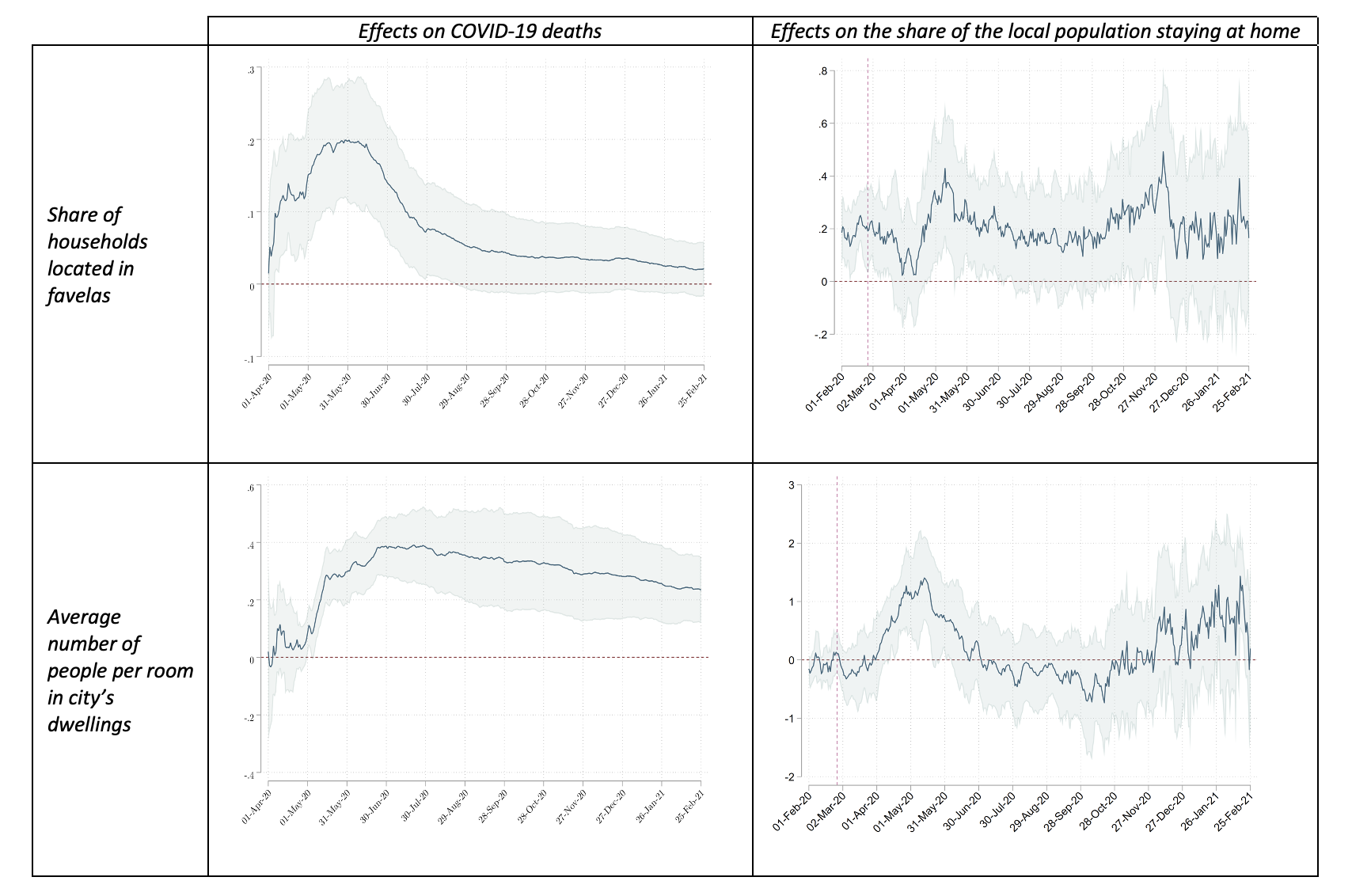 Not all the city characteristics that correlate with more COVID-19 deaths per capita also correlate with increased mobility. In Brazil, cities with high socioeconomic vulnerabilities were disproportionately affected by the pandemic during the first wave, despite the fact that their population was more likelyto stay at home during much of the period of the study. As shown in Figure 2, this was true for cities that had a relatively larger share of their households located in favelas (slums), and those that also had higher levels of residential crowding, as captured by the average number of people per room in the local households. In both cases, the effect on the number of deaths per capita was disproportionately large in the early months of the pandemic, particularly during the first wave.