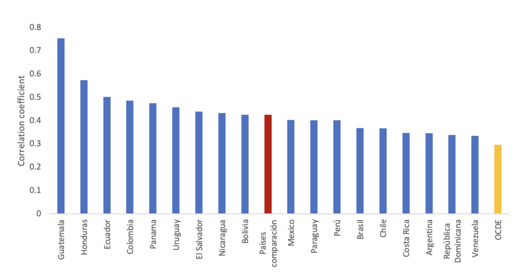 The graph shows that not all countries are the same: The least mobile (such as Honduras and Guatemala) have correlation coefficients above 0.5, while the most mobile (such as Argentina and the Dominican Republic) have coefficients below 0.35. It is important to note that, although the intergenerational correlation coefficients for education in the region are higher than in developed countries, they are not so different from those observed in countries with a similar level of development (comparison countries in the graph).