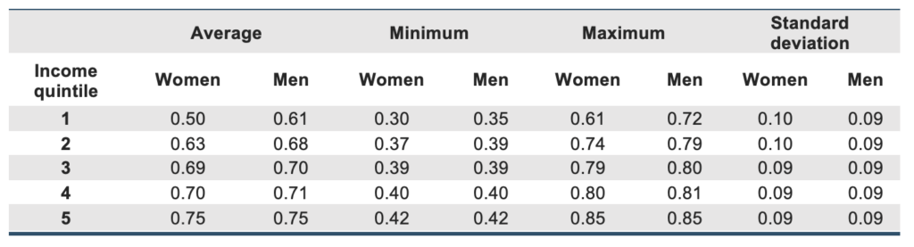 We identify clear gender, geographic and socioeconomic cleavages. Women, on average, have slightly lower job accessibility than men, at 65.1% vs. 68.7%. This gap is virtually non-existent in the wealthiest quintile, but it is quite large in the poorest one, with poorer women able to reach 50% of jobs, compared to 60% of poorer men. This mobility gap, in turn, puts additional pressure on gender wage disparities, especially in the most vulnerable sectors, since women have to allocate a greater share of their income to pay for their commute to work.