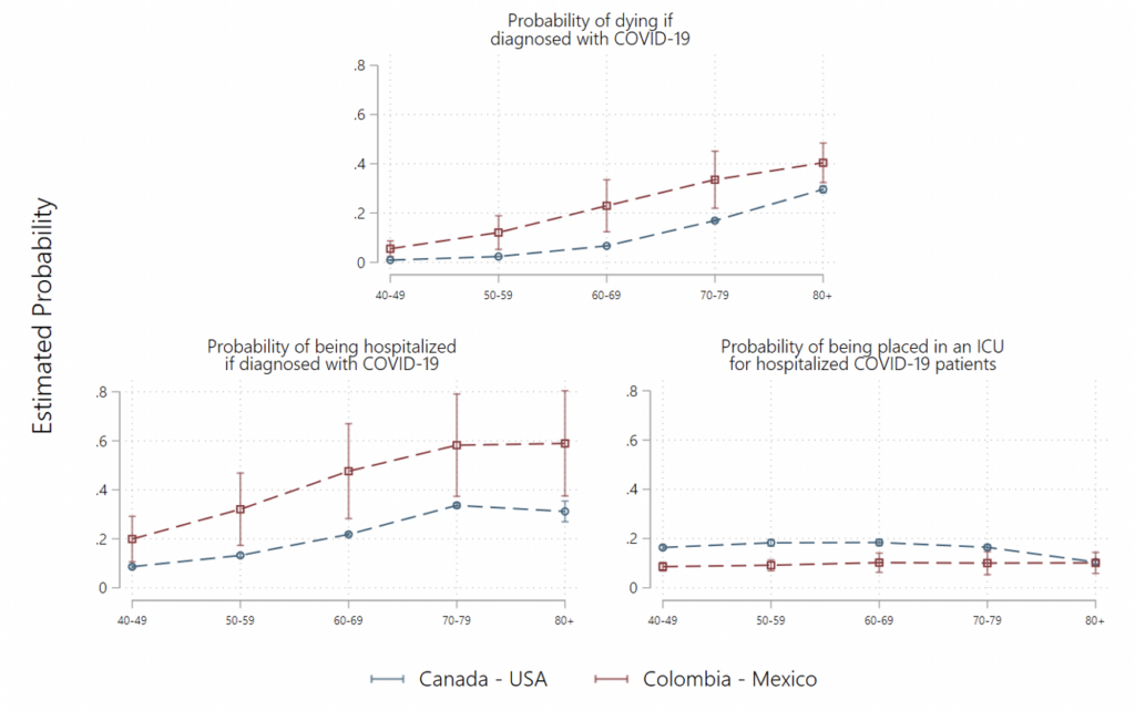 Our research found that younger populations are relatively less likely to recover from Covid-19 in developing than in rich countries. Non-elderly Covid-19 patients are more likely to die from the disease in Mexico and Colombia than they are in the US and Canada, whereas there are no significant differences among the population aged 80 and older (Figure 2). In fact, the average Covid-19 positive patient in the 40-49 age group in the Colombia and Mexico sample has statistically the same average probability of dying from Covid-19 as a Covid-19 positive patient in the 60-69 age group in Canada or the US.