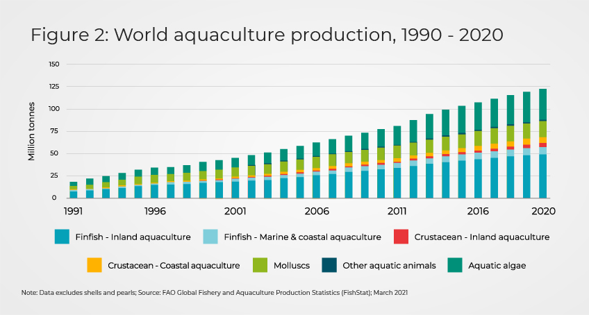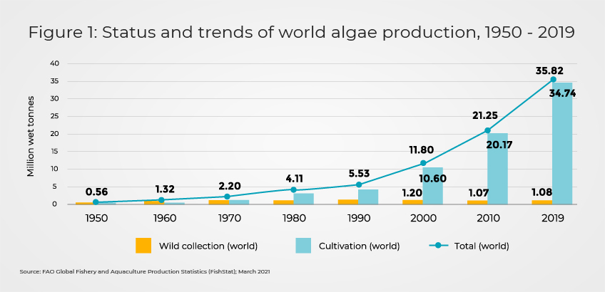 In 2020 alone, the global production of algae, including seaweeds and microalgae, surpassed 35 million tonnes, outpacing the growth of any other aquaculture category (See Figure 2). Seaweed cultivation commonly employs raft or longline systems, often grown on the seafloor.