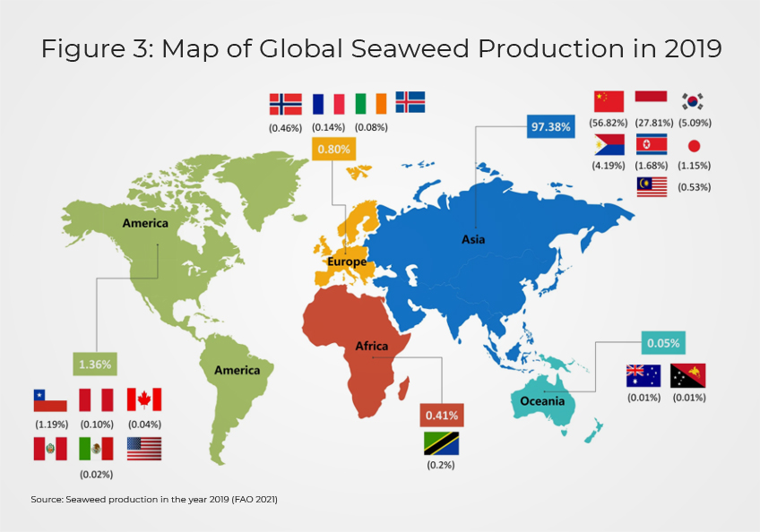 This industry has emerged as a highly promising resource owing to its remarkable adaptability, brief development period, and sustainable nature which presents a significant breakthrough in addressing prospective resource crises. However, its practice is limited to a few countries, compared to other aquatic species being farmed worldwide: although global production was contributed by 54 countries/territories, most of them being in Asia (See Figure 3).