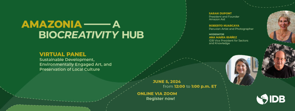 As part of this initiative, on June 5th, the IDB organized a virtual panel on “Sustainable Development, Environmentally Committed Art, and Local Culture Preservation,” to contribute to the important conversation about the role of art and culture in driving changes for a sustainable future in the Amazon region.