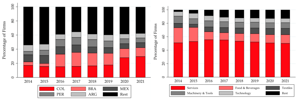 Source: Authors’ calculations based on data from ConnectAmericas.Companies from countries around the world can join ConnectAmericas. However, since it was purposely created to favor the internationalization of LAC-based businesses, these countries account for the largest numbers of firms: Colombia, Brazil, Mexico, Peru, and Argentina (figure 2, left panel).