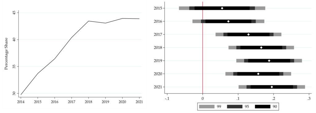Source: Authors’ calculations based on data from ConnectAmericas. Only companies that reported ownership by gender are included.Note: The figure on the right is based on a regression of an indicator of firms’ ownership by gender on country-sector fixed effects –which accounts for the asymmetric distribution of firms across countries and sectors-- and year fixed effects. The diamonds correspond to the estimated coefficients on the year variables and the bars around them the respective confidence intervals at alternative levels (90%, 95%, and 99%).