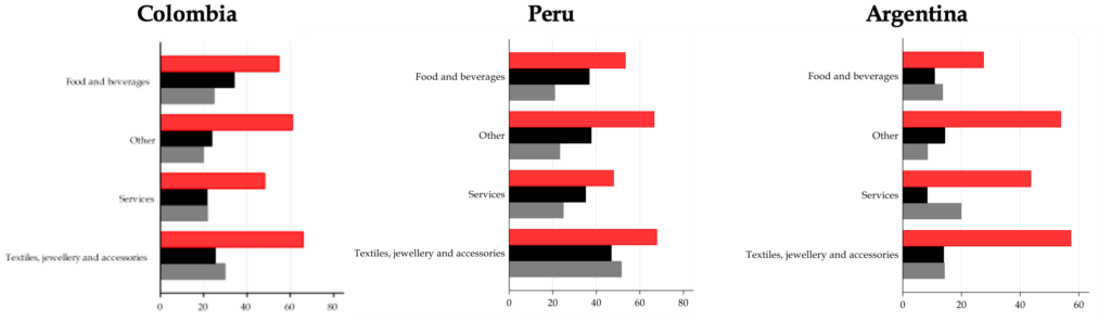 Source: Authors’ calculations based on ConnectAmericas and World Bank’s Enterprise Surveys data. The red bars show the percentage shares of female-owned firms in ConnectAmericas, the black bars show the percentage share of female-owned firms in the economy as a whole, and the gray bars show the percentage share of female-owned exporters in the economy as a whole. Only the countries with the largest number of firms in ConnectAmericas (figure 2) and with sectoral data on gender from both ConnectAmericas and World Bank’s Enterprise Surveys are included. The last available data of the latter are used for each country.