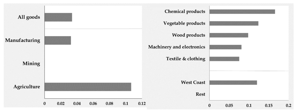 There are non-trivial differences across sectors. The maritime transport-intensive agriculture and manufacturing sectors exhibit the strongest responses. Specific industries such as chemical products, vegetable products, wood products, machinery and electronics, and textile and clothing stand out (figure 1, right panel). The same applies to shipments that arrive in the U.S. via the West Coast. Ports such as Los Angeles and Long Beach experienced some of the longest delays and disruptions from the pandemic.