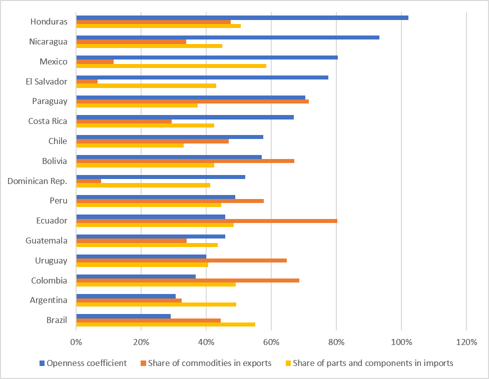 Notes: Openness: exports + imports of goods and services as a % of GDP; Share of commodities: exports of primary and energy products as a % of total exports of goods; Share of parts and components: exports of intermediate goods and parts and components of capital goods as a % of total exports of goods. The most recent years are only shown for countries for which complete, up-to-date data is available. Countries are ranked by openness coefficient.