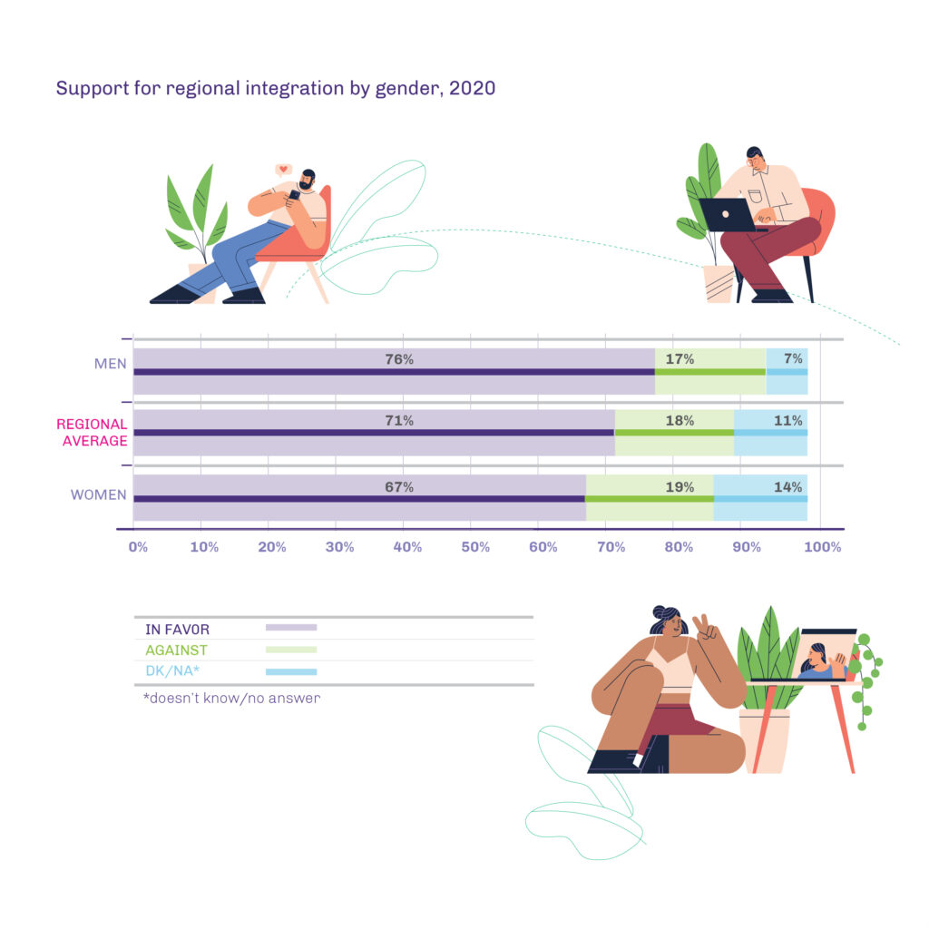 On the other hand, economic stagnation and crisis have always been associated with a deterioration in the social consensus around integration. For example, the slowdown that began in 2014 followed a 5-point drop in support for integration in subsequent years. But since 2018, support for integration has remained at 71%. It is striking that despite the pandemic, support for integration has remained stable, rather than slumping as it did during previous crises. Then, it may be the case that Latin Americans see international trade and regional integration as channels for recovery from the current economic crisis.