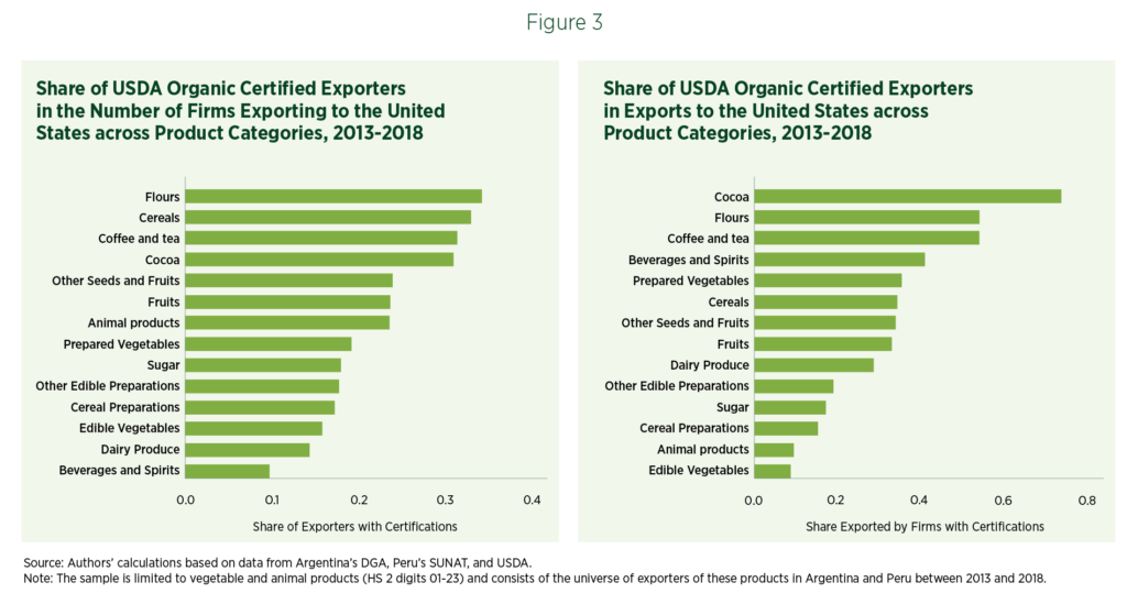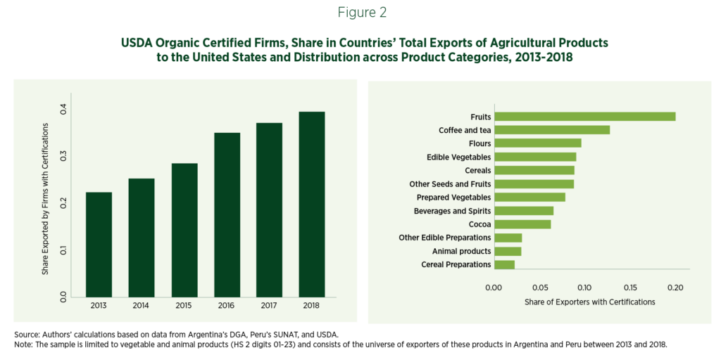 Firms certified as organic by the USDA accounted for roughly 40% of Argentina’s and Peru’s total exports of agricultural products in 2018, almost doubling since 2013 (Figure 2, left panel). USDA-certified firms were concentrated in a handful of agricultural product categories and the largest of these categories were fruits, coffee/tea, and flours (Figure 2, right panel).