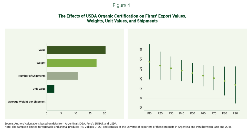 To understand this potential, we examine the effects of organic certification on firms’ foreign sales. In so doing, we focus on two Latin American exporting countries: Argentina, the country with the largest area of agricultural farmland in the region; and Peru, the country with the most organic producers in the region. On the importing side, we concentrate on the United States, which accounted for approximately 42% of worldwide retail sales of organic foods and drinks – by far the largest organic market in the world in 2019 (FiBL-IFOAM, 2021). We explore how USDA organic certification affects overall firms’ exports and their different components, especially export prices (unit values). The evidence suggests that USDA organic certification is associated with a 20% increase in sales to the United States. This increase can be traced back to larger volumes, more frequent shipments and, importantly, higher unit values.
