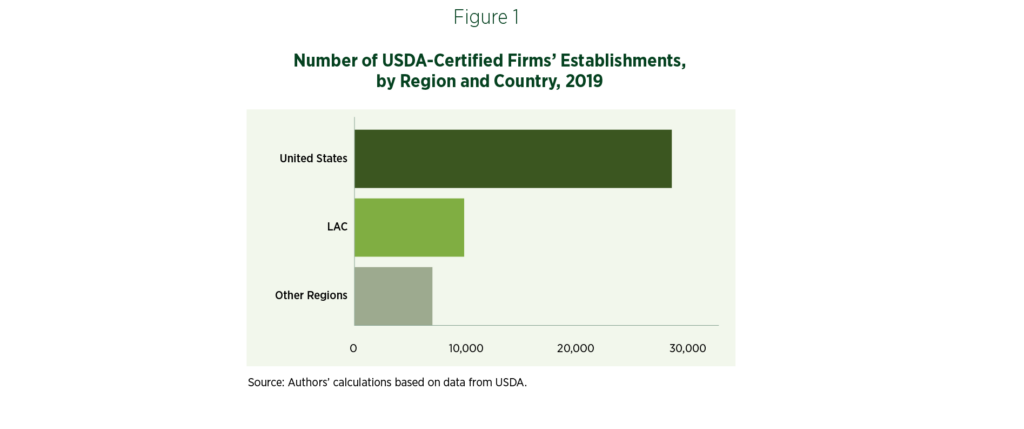 Firms must be certified to label and sell their products as organic. This requires undergoing a formal process through which an official certification body verifies that the firm complies with regulations in the country in question (e.g., US Department of Agriculture –USDA- in the United States). Consistent with demand expansion, the number of certified firms has increased substantially in recent years. For instance, the total number of establishments certified as organic by the USDA exceeded 44,500 in 2019 after growing approximately 65% since 2013. LAC firms accounted for 21% of this total (Figure 1).