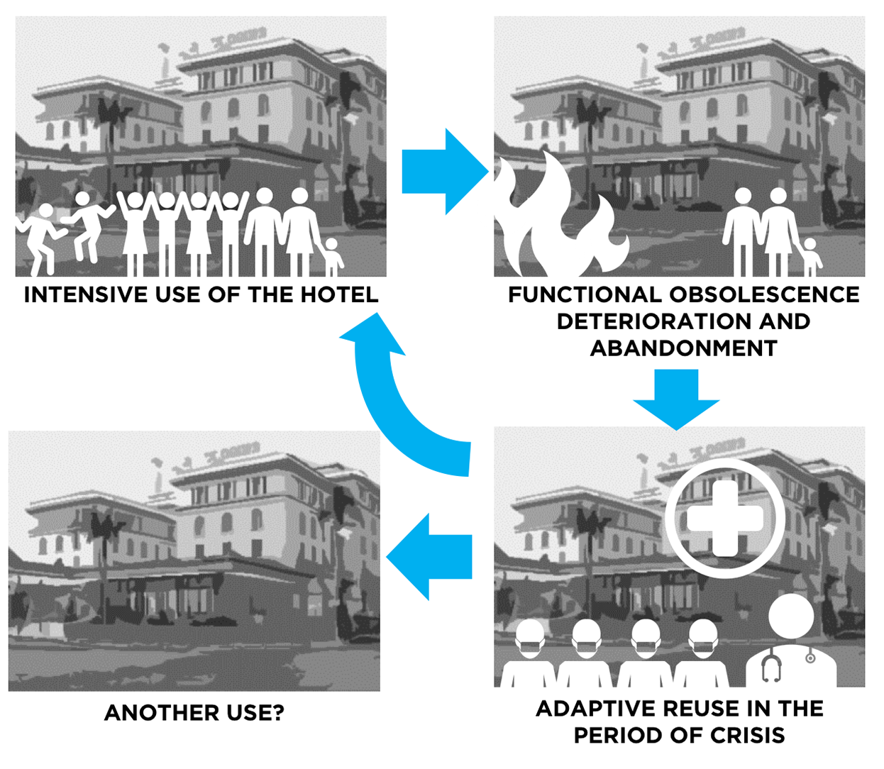 Continuous process of adaptive rehabilitation, example hotel O'Higgins. Other hotels are exploring the possibilities of taking in more critical patients and temporarily turning their souvenir shops into pharmacies and offices into laboratories. They are adding generators and ventilation or extraction systems to support equipment and networks of medical technology and removing carpets and furniture from rooms for more critically ill patients. Even in these cases, the intervention is reversible. In turn, in the United States only, 3.3 million hotel rooms were destined for medical personnel who work on COVID-19 to avoid they return to their homes and being sources of contagion. If we consider the physiological aspects of the crisis, it is more dignified and encouraging staying for recovery in a Hotel-to-hospital than in a temporary awning or tent structure. The latter abruptly interrupts the urban landscape increasing the perception of crisis or panic in a city. A field hospital, which invades an open space, generates more impact than the reuse of a building that remained closed.