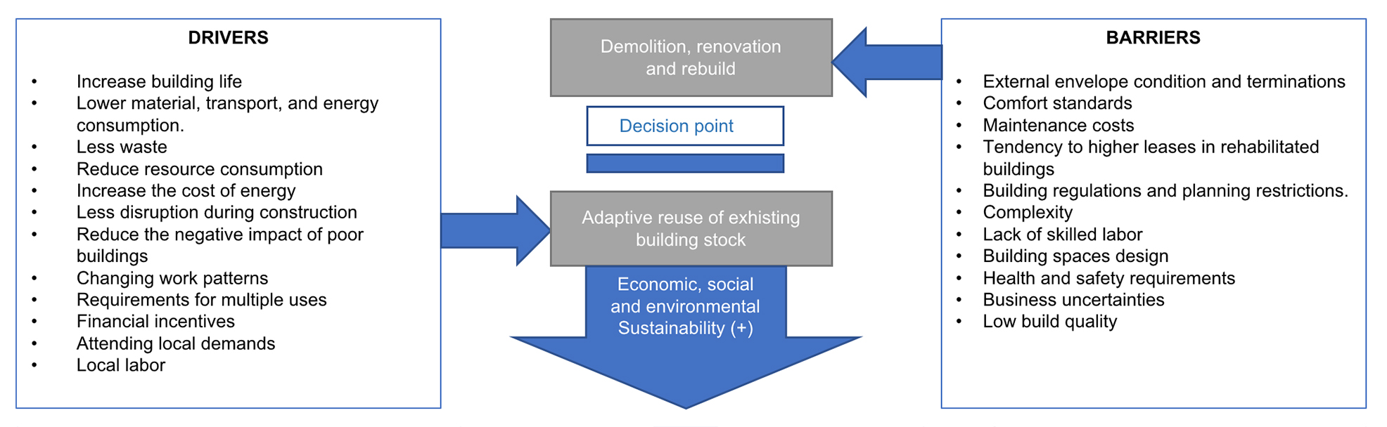 O’Higgins Hotel versus field hospital as a hospital care space COVID-19. Source: Photo 1: Hotel O'Higgins, Viña del Mar, Valparaíso Region, Chile, Carlos Figueroa, Creative Commons Attribution-Share Alike 4.0 International, Wikimedia Commons. Photo 2: Field hospital in Veorna, Italy. Adert, Creative Commons Attribution-Share Alike 4.0 International, Wikimedia Commons. Photo 3: Field Hospital in Gothenburg, Sweden. CFCF, Creative Commons Attribution-Share Alike 4.0 International, Wikimedia Commons. Similar to the hotel industry, Airbnb also welcomes medical personnel in Italy, and 200 Airbnb in Barcelona welcome homeless people during this crisis. Furthermore, the rental leases, previously destined to tourists for just a couple of days, are now being extended for longer terms, helping to respond to the housing deficit in good locations. Usually, the iconic megastructures of our cities are the ones facing adaptive processes, a factor key to COVID-19 for social distancing in bigger spaces. The iconic structures, often heritage assets, are a point of reference in dense areas and can facilitate the service systems and emergency response mechanisms. The selected spaces, both publicly and privately owned, usually have low or zero acquisition costs to enable quick and efficient adaptation. The interest in facilitating their adaptive reuse relies also on the collective interest for the conservation of these sites, since it could have historical value due to the events that occurred there; aesthetic value in its own architecture; as well as symbolic value or social value for a specific community. The best way to preserve a building in a sustainable way is to keep it in use, respecting its original use or assigning a new one. We have also seen convention centers used during the emergency of COVID-19, such as Espacio Riesco in Santiago, Chile or the Javits Center in New York. The lease of the private convention center Espacio Riesco, by the Chilean Ministry of Health was controversial and enabled in a matter of weeks. This process provides us with various lessons about the adaptation of private buildings by public entities. This structure is in the area most affected by the pandemic in Santiago; it has strategic access and electric generators for hospital operations despite power cuts, among other conditions. However, its leasing brings into discussion the need to justify the comparative advantages of this infrastructure versus others at zero cost in the area, and the need to publish the administrative acts of the procurement process in transparency portals. A different example is the Jacob Javits Convention Center in New York. This structure is owned and operated by the municipality and was habilitated for the emergency with local funds and made available to the Federal government, while waiting for a reimbursement from the national level. Like many spaces in crisis, it was habilitated by agencies associated with the military forces. In less than a week, it already had 1,000 hospital beds. Military experts pointed out that the physical adaptation was not the problem as the process was similar to the one used after Hurricane Katrina in New Orleans or Sandy in Puerto Rico. The management of the hospital was the issue, few know how to do it. Adaptive rehabilitation must be accompanied by good management models, from the very beginning of the redesign process. Models can be complex for long-term polyfunctional structures, but they must be as simple and clear as possible under emergency protocols. If the adaptation of the existing building for a new use is more profound, then the intervention criteria drawn from heritage preservation can guide us. Depending on the building and its level of protection, the image or icon associated with the facade or building envelope, the typology of the building and its structural system are commonly maintained, while interior spaces are modified according to the new demands. For example, a building in a patio house type will hardly work well in a new use, socially and environmentally, if we close the light and/or ventilation coming from the patio to accommodate new functions. When a building designed for a specific use is no longer in demand for that use or is in disuse, it may be because its physical conditions no longer fulfill current regulations, its area or land already has another vocation, or its accessibility/connectivity no longer competes with other emerging areas of the city. Then, not only architectural challenges of functionality, livability, and comfort methods come into place, but also legal and/or regulatory challenges emerge to change land use in the long term (outside of emergency periods). In the case of objects, if they are no longer useful, they easily end up in a closet or garbage can. In the case of larger and more expensive buildings, functional obsolescence forces us to think about how to match the available structure and the new needs). Similarly, there are key opportunities and barriers that facilitate decision-making for rehabilitation (See Figure below).