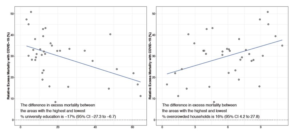 Areas with the highest educational levels (represented by the percentage of the population aged 25 years or older that completed university education) presented a difference in excess mortality of about 17% between areas with the highest and lowest educational levels.