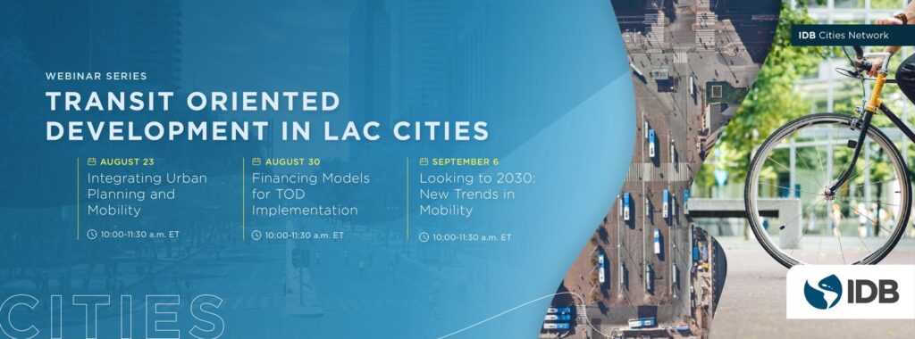 To support urban planners in the region to learn more about TOD, the IDB has organized three free access webinars. Through the presentation of case studies and dialogue between experts and public policy leaders, we seek to systematize best practices, identify opportunities and address challenges in the search for a more efficient, equitable and sustainable urban future for all.