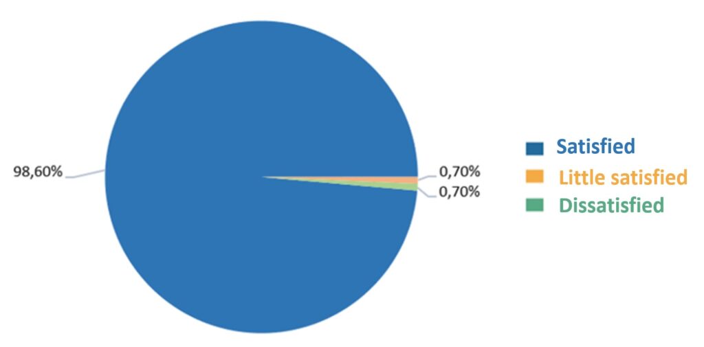 According to CAPTUDATA, the project supervision tool implemented by the IDB in coordination with MIDUVI, the evaluation of the program by beneficiary families of the program is satisfactory. From a sample of 175 families, from different provinces to the question of whether or not they are satisfied with the delivered housing, as of December 2021 it is observed that 98.60% are satisfied, 0.70% are not very satisfied and 0.70% are dissatisfied (Graph 1).