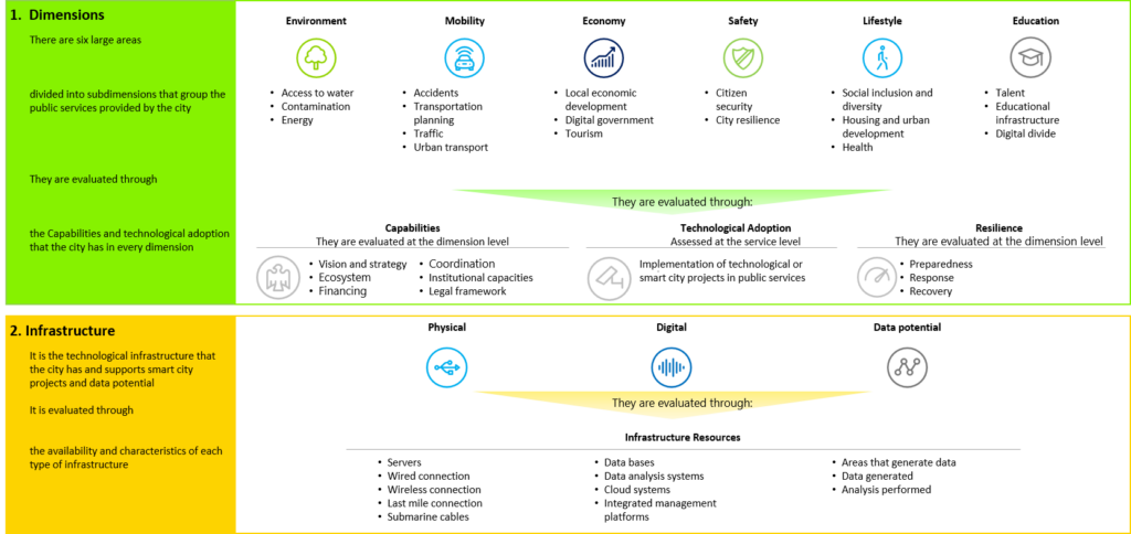 This innovative smart methodology includes two areas of analysis: dimensions and infrastructure.