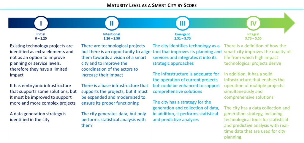 The methodology collects quantitative (data analysis) and qualitative (interviews) information to carry out this evaluation, so the results provide a numerical score of the current level of maturity of the city. This score is located on a scale of 0 to 5 in 4 levels of smart city development: