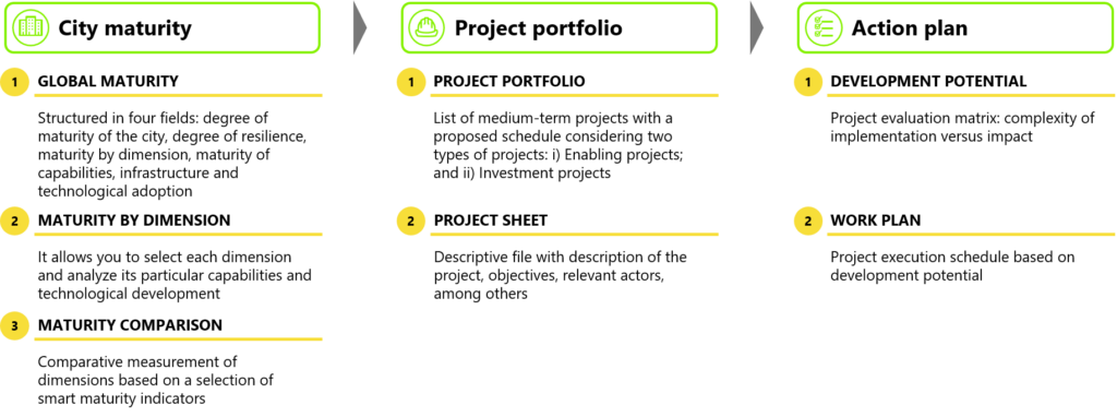 After applying the methodology, cities can identify their level of maturity. After this, they are ready to choose specific projects that allow them to improve their maturity level as a smart city, as well as to formulate a medium-term action plan to implement the projects.