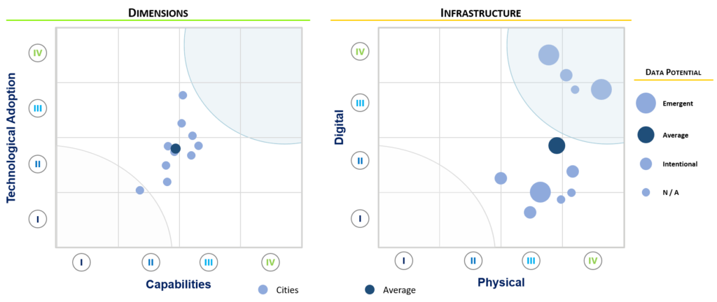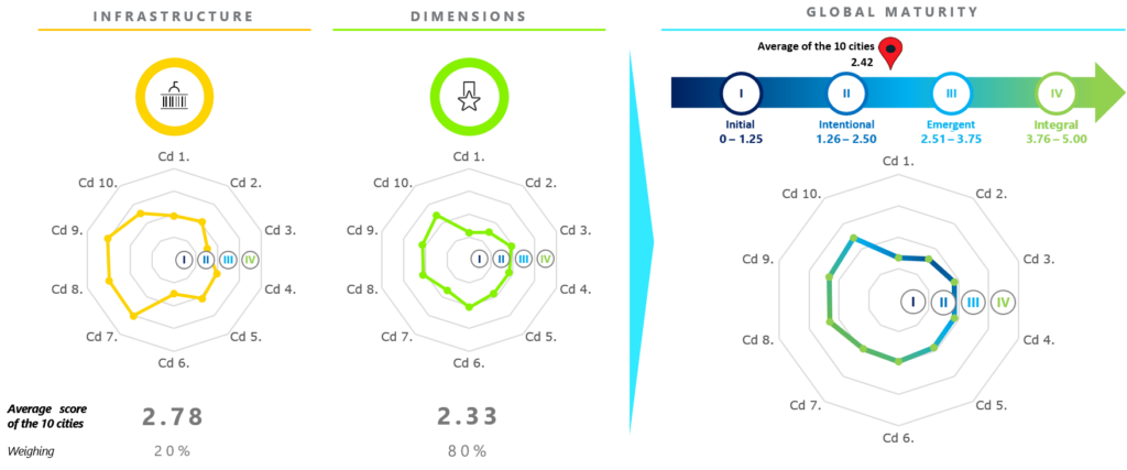 The IDB has implemented this methodology in 10 cities throughout LAC. The outcome has identified that, on average, the evaluated cities present a global maturity of 2.42, placing them in a Level II (intentional) with strengths in infrastructure: