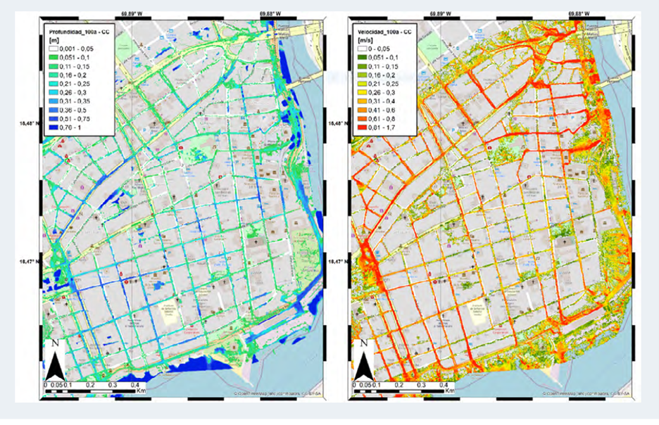 The resulting flood threat maps, detailing flood depths and velocities throughout the CCSD, were fundamental for the development of adaptation strategies. A participatory workshop with stakeholders, including MITUR, the National District Municipality (NDM), Monumental Heritage, and public space designers, allowed defining specific recommendations for Calle El Conde and Parque Colón.