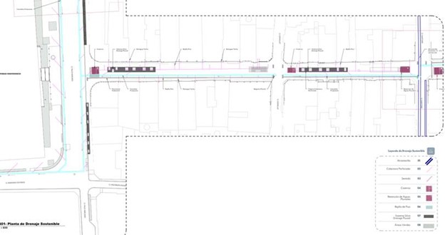 - Silva System of stormwater drainage and permeable pavements: these solutions allow water infiltration into the soil, decreasing runoff and improving rainwater management. They were applied in important intersections, such as Palo Hincado, Espaillat, Santomé, Sánchez, José Reyes, 19 de Marzo, and Duarte, with permeable pavements indicated in the gray areas of the plans.