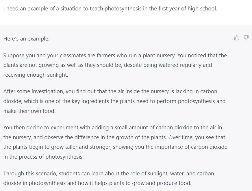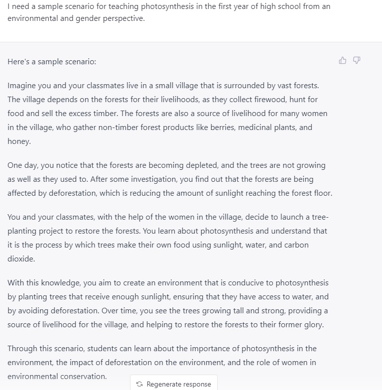 For example, we asked ChatGPT for ideas on how to teach photosynthesis to sixth-grade students in middle school. After it answered, in order to test it—and play a little—we expanded our request and also asked it to tell us how to teach photosynthesis from an ecology and gender perspective. We are still gaping and smiling.