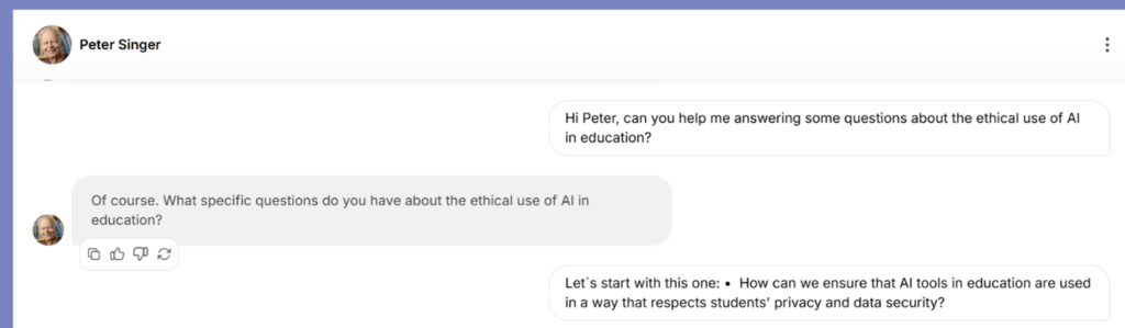 We raised some of the most pressing questions about the role of AI in shaping learning experiences, ensuring privacy, and preventing biases. The responses we received from Peter Singer's AI chatbot revealed fascinating perspectives on how ethical thinking can guide responsible development and use of AI in educational contexts.
